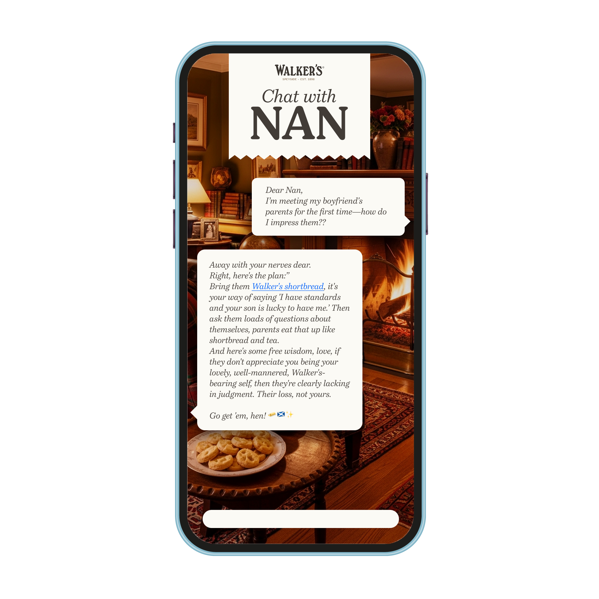 Walker’s is associated with a very niche time and place: your grandma’s house at Christmas. They needed to break out of that category and get younger audiences to snack on Walker’s year-round. But what if being the brand for grandma wasn’t a liability, but a major cultural asset? Enter Nan, your adopted Scottish granny. Nan introduces the delicious heritage of Walker’s to a new generation – without losing a crumb of tradition.